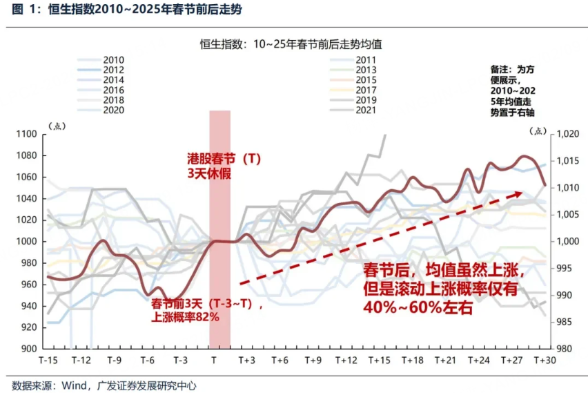 春节前3个交易日,由于资金回补仓位、情绪修复、政策预期等因素,指数上涨概率高达82%,涨幅中位数为4.7%,(另外恒科指上涨概率为72.7%,涨幅中位数约6.3%),这个没有什么异议;