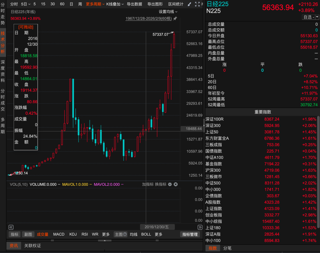 日经225早盘已经飙升到57337点位了,全天也是收在高点。而且,最重要的是,日经225指数创先了历史新高,且过去这1-2年一直在创新高。2026年开年这1个月左右,又涨了12%。