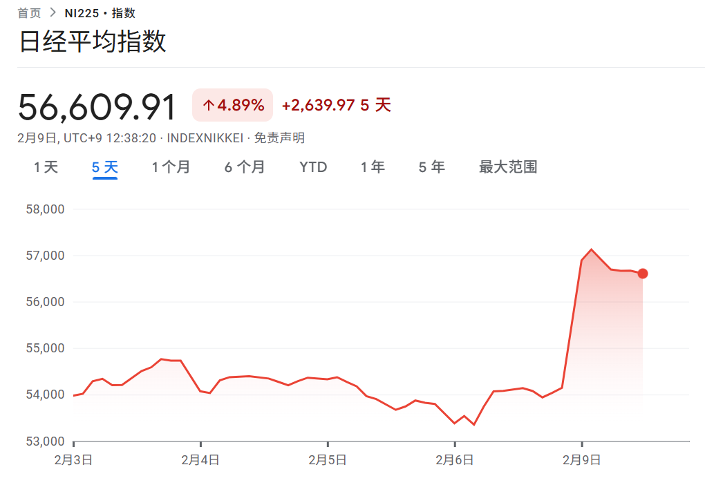 选举结果公布后,日本股市的行情先被点燃了。日经225指数期货在东京早盘交易中一度上涨超过3%,现货市场开盘后继续冲高,盘中刷新历史新高,涨幅一度扩大到5.7%。