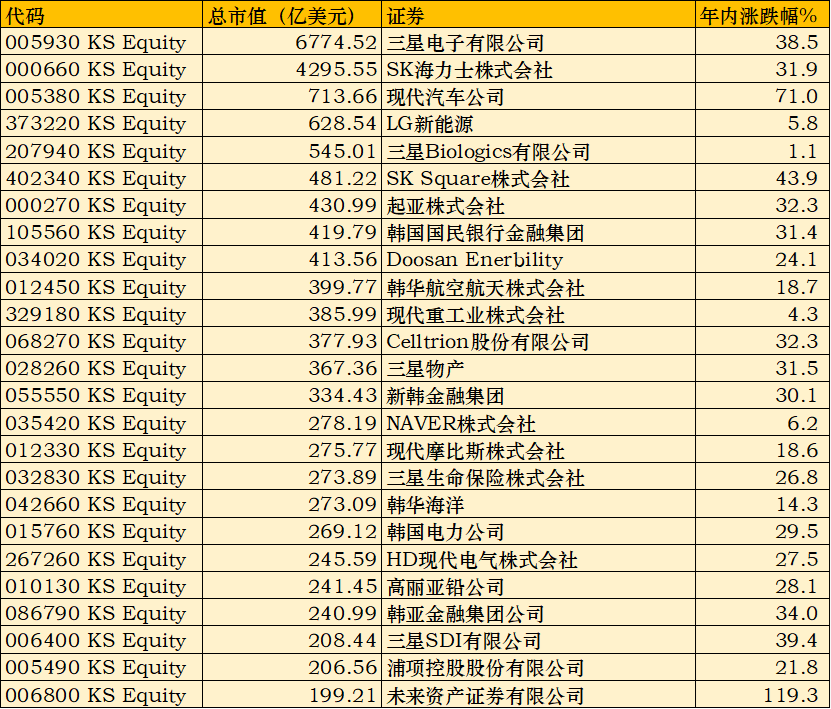 巨头权重过高以外,韩国股市各大公司还交叉持股,如韩国第六大市值公司SK Square是SK海力士的大股东,年内涨幅接近44%;市值第七大的起亚株式会社是现代汽车的控股子公司,且起亚持有少量现代汽车股权,年内涨幅超32%;市值高达367亿美元的三星物产也持有少量的三星电子股权,年内涨幅超31%: