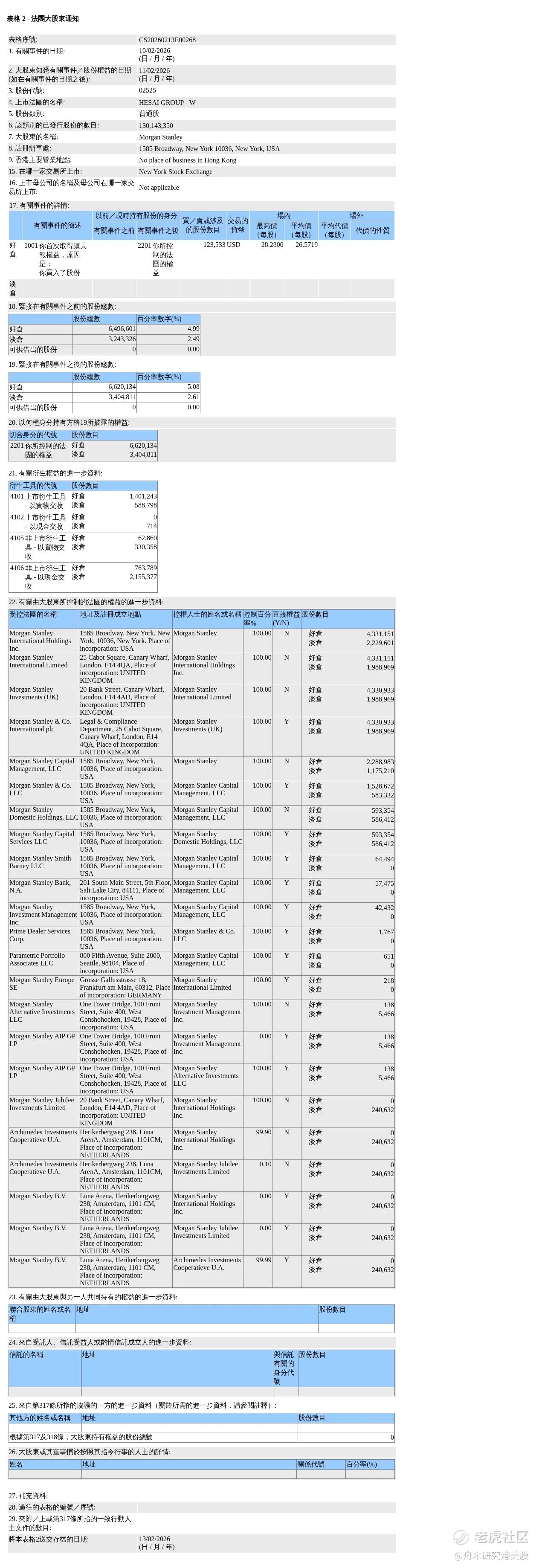 2月13日报道,根据香港联交所2月13日披露的文件,摩根士丹利(Morgan Stanley)于2月10日以每股均价26.5719美元增持 $禾赛-W(02525)$ 12.35万股普通股股份,价值约328.25万美元。增持后,摩根士丹利最新持股数目为662.01万股股份,好仓比例由4.99%升至5.08%。