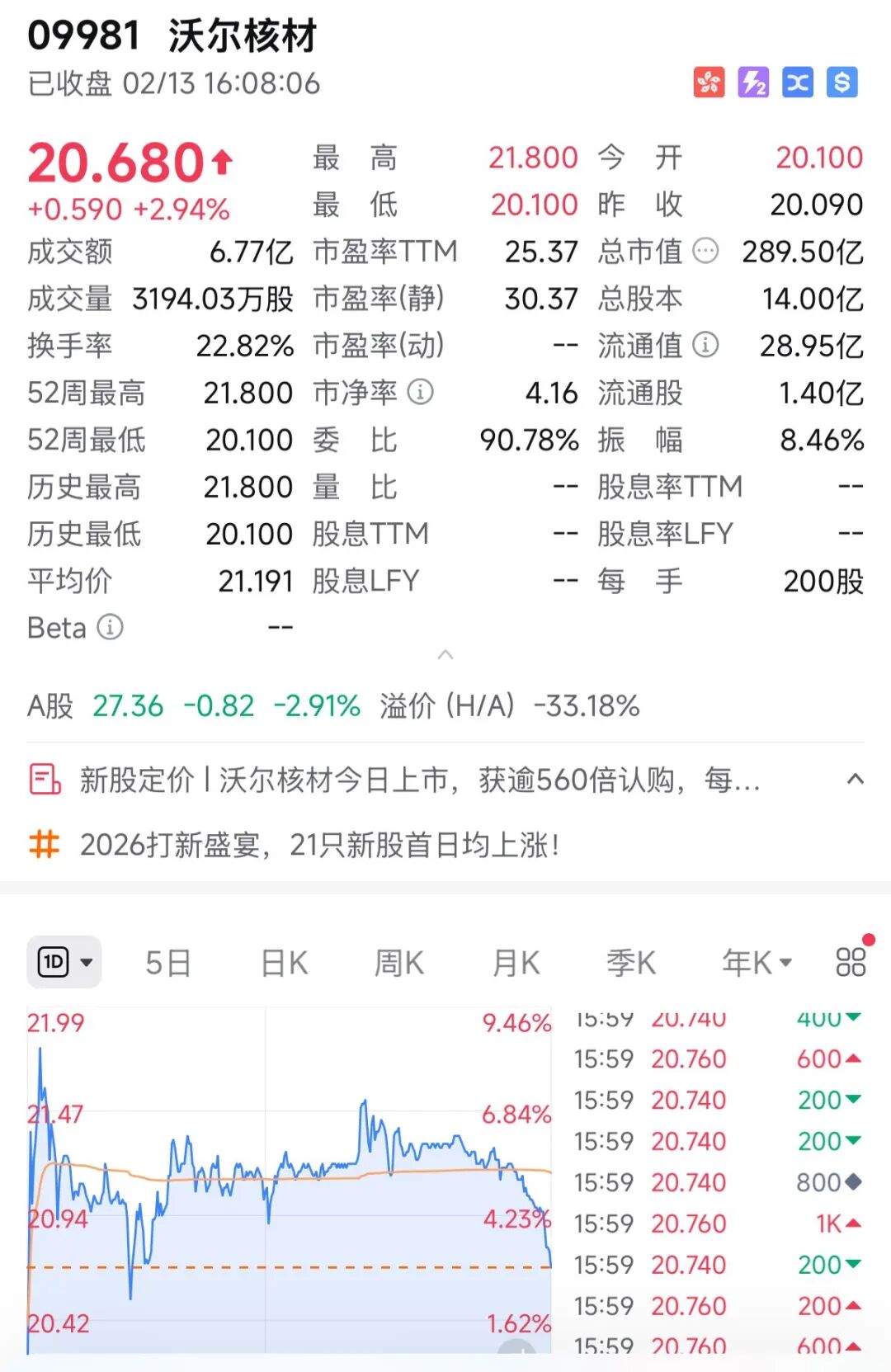 沃尔新材,上市前我预估也就10%左右,暗盘前我看很多人都说有30%以上的涨幅。最终开盘后,拉了坨大的,整个暗盘基本上就在5%以内波动,中一手赚个200块,都不够吃顿海底捞。鸡肋。