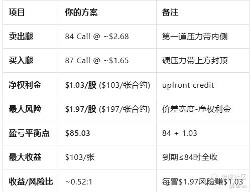 参考上面那个期权链的截图的报价区间,目前这个策略的中间价大约 2.68 美元/股(表格里 84C 约 2.60–2.76,我们暂且取一个中位)