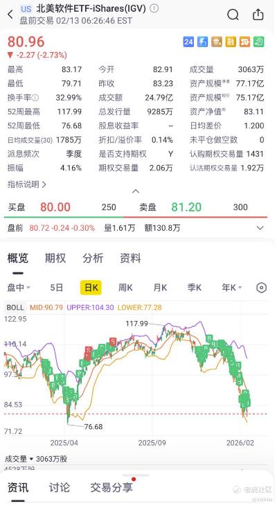 过去数周 $北美软件ETF-iShares(IGV)$ 从 70 多美元的阶段低位企稳反抽,整体处在"冲高回落、高位震荡"的节奏里,在84–86美元一带屡次受阻。从K线图上看,去年的多次反弹高点与短期密集成交区大致都落在这个上沿附近)。当前价格在80–81美元,属于“下沿回升但上方抛压尚未清理”的结构,第一道心理/结构压力:84–85 美元,靠近近期反弹上沿与密集成交区,资金到此更偏向兑现。一直跌,我一直加仓,加仓到那些B B B 都快要连成一片草原了 [捂脸]