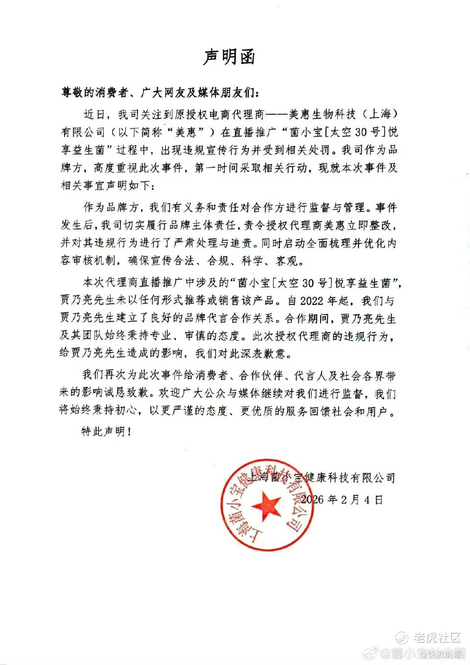 菌小宝方面随后于2026年2月4日发布声明回应称,公司已切实履行品牌主体责任,责令涉事代理商立即整改,并对其违规行为进行了严肃处理和追责。