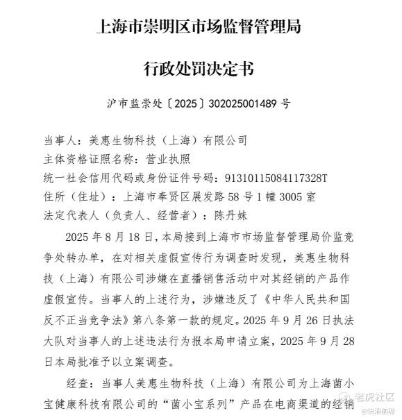 根据上海市崇明区市场监督管理局公示的行政处罚信息,美惠生物科技(上海)有限公司在有赞平台“菌小宝官方旗舰店”直播中,宣称菌小宝“太空30号”可“改善炎症”“10天见效、30天巩固”等,被认定为普通食品被宣传为具有治疗功效,构成虚假宣传并被罚款3万元。