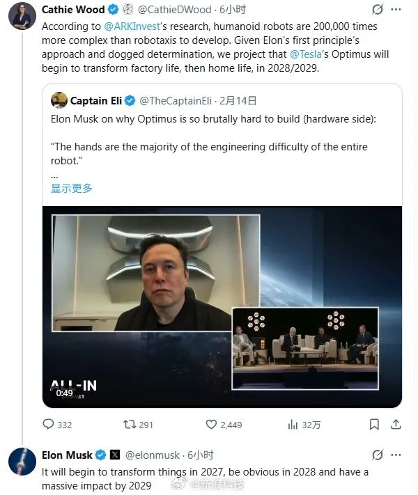 2月15日消息,近日,方舟基金创始人——“木头姐”Cathie Wood在社交平台上发帖称:“根据ARKInvest的研究,开发人形机器人要比开发机器人出租车复杂20万倍。鉴于埃隆·马斯克秉持的第一原则和坚定决心,我们预测特斯拉的擎天柱机器人将在2028/2029年开始改变工厂生活,进而改变家庭生活。”