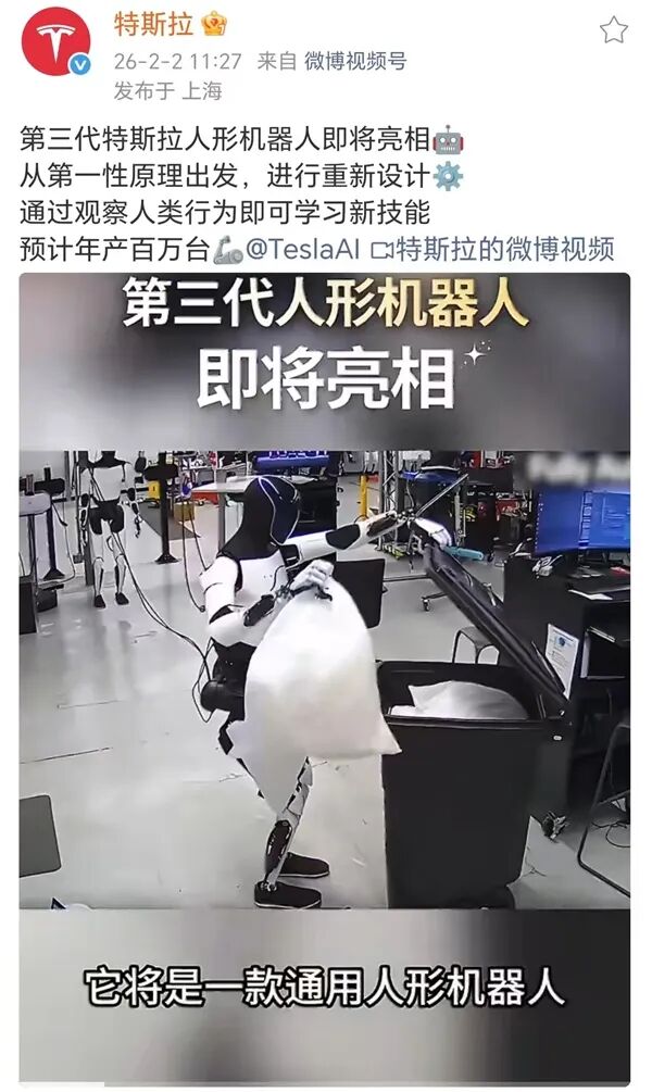 此外,马斯克在2026年1月下旬达沃斯世界经济论坛上也曾透露,Optimus 已进入量产倒计时。