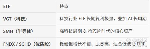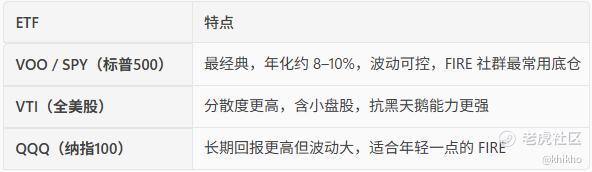 首先想到的,就是适合大多数人的一些核心长期积累型 ETF,例如 $标普500ETF(SPY)$ , $纳指100ETF(QQQ)$ 等,这些ETF的年化受益都不错,而且风险比较小。目标年化 7–10%,用复利来加速 FIRE,这个组合是最经典、最稳健的一类。