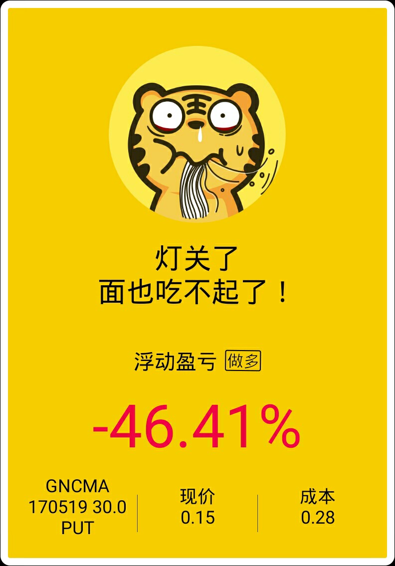 $GNCMA 20170519 30.0 PUT(GNCMA)$ #晒单有奖# 一手期权,大涨时买的,买急了,时间还长,希望能翻盘