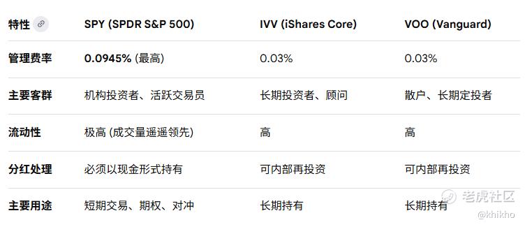 5. 对长期投资者IVV 与 VOO 在费率上更优,虽然 SPY 综合优势明显,但长期被动投资者可能更偏向: