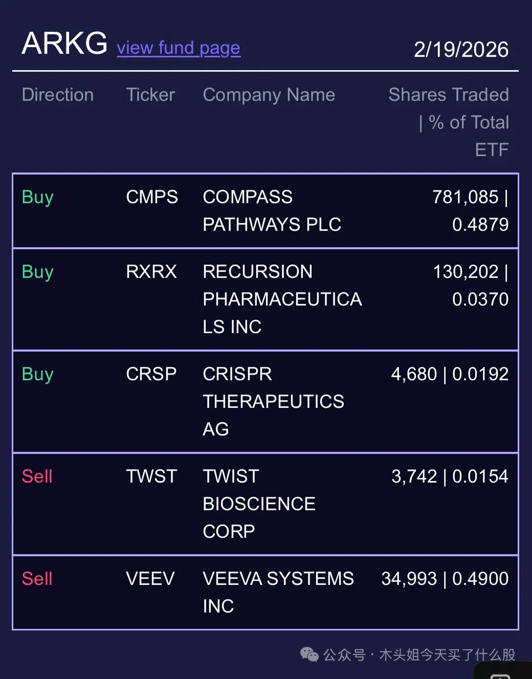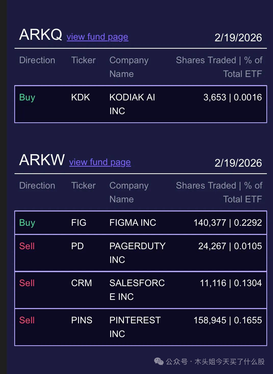 木头姐今天买入250万美元FIG、290万美元RXRX、150万美元CRSP、2.6万美元SLMT、3.3万美元KDK、650万美元CMPS、78万美元KLAR、10万美元CNTN。
