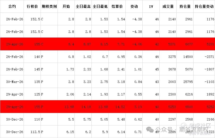 (2)阿里:2月最大持仓范围140-175,窝轮牛熊街货分布135-170,今收147.1,下跌4.91%。期权盘路变化超过1000张的仓位如下,红色是增仓较大的,4月的155购和155沽,分别增仓5200张,数量一样,有点像是同一个大佬所为。有可能是持有现金准备接货的“合成多头”,也有可能是持有股票构建的“领口策略”,还有可能是买跨。从权利金的角度来说,“合成多头”的概率更大一些。