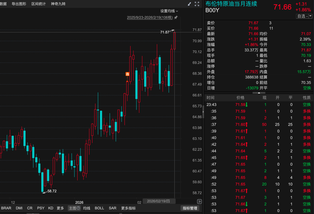 26年至今,原油价格持续往上涨,今天已经到了71.87的价格了。
