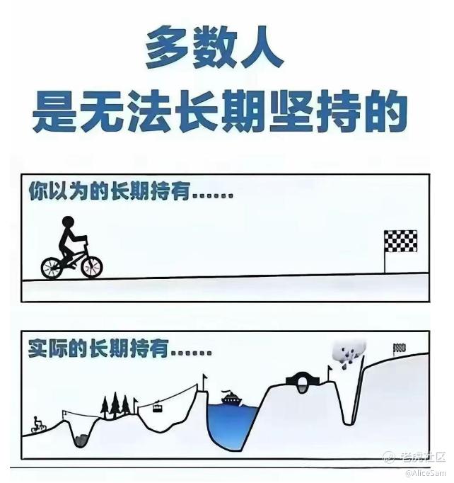 但其实,长期持有的路,可能像图里的下半部分,有起,也有伏,小回升,大坑洞,当然,他们的每一个坑,都是投资生命周期的一环,有时候年报季报后的一次性估值校准,优质资产也常见跌下去10% 甚至 20%的,例如现在的微软,对长期投资的人来说,目前可能就在一个坑里蹲着呢。[鬼脸]