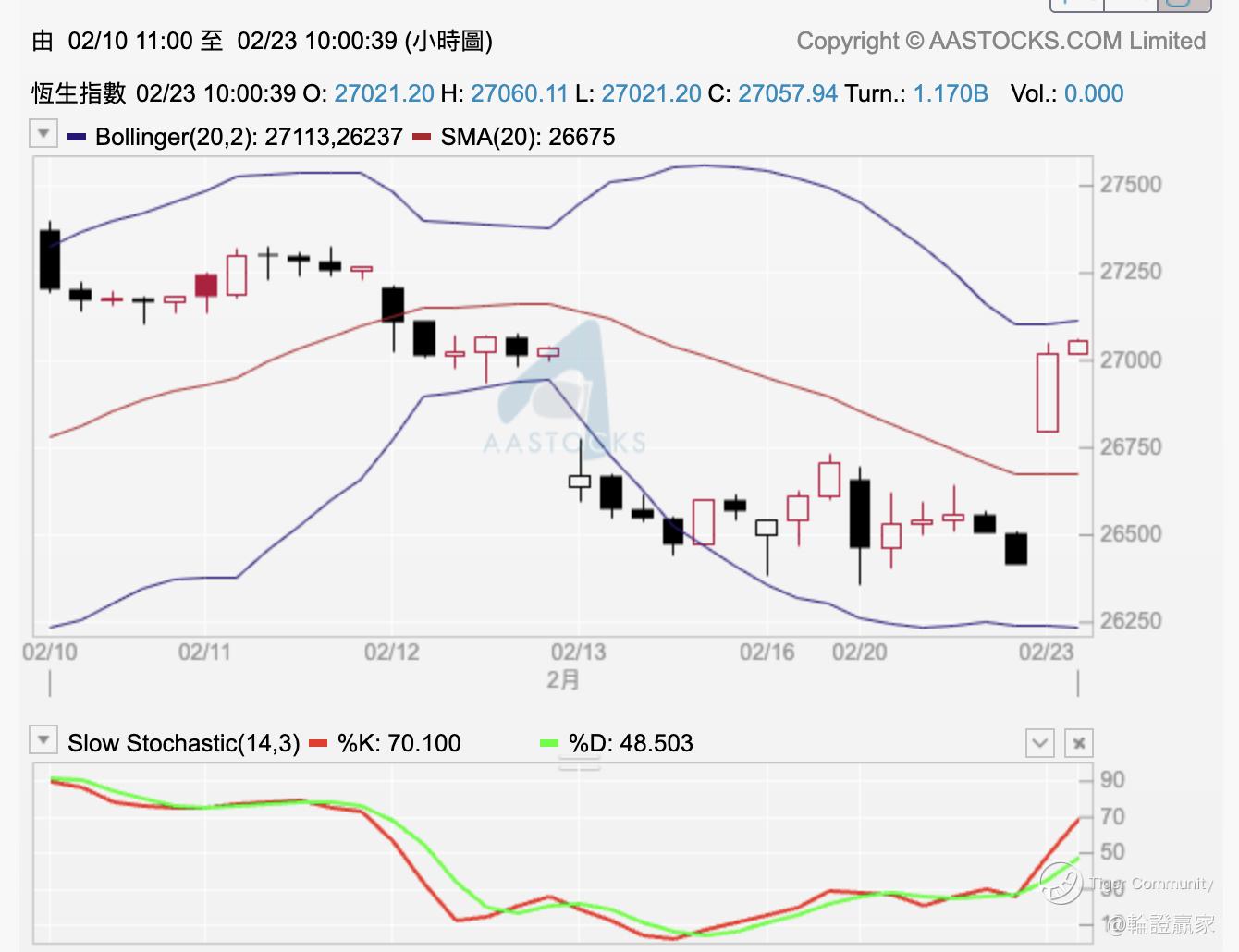 10点前睇小时图见Slow STC(14.3)两线已经出咗触底上,而整条保历加通道都已经向横,Swing Trade系有条件出现返。