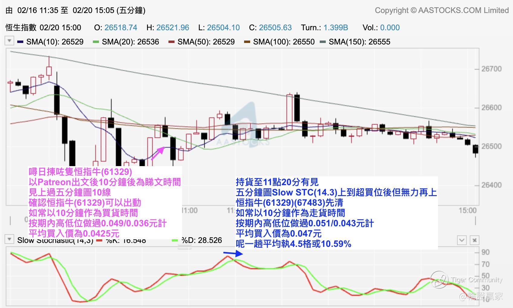 上星期五(2月20日)拣咗只 $UB#HSI RC2810K.C(61329)$ 出嚟,Mark住五分钟图10线有过到嘅话就出动做返Swing Trade见Slow STC(14.3)上到超买位走人,过夜嗰注食唔到都博马年第一日先收一注正数先。