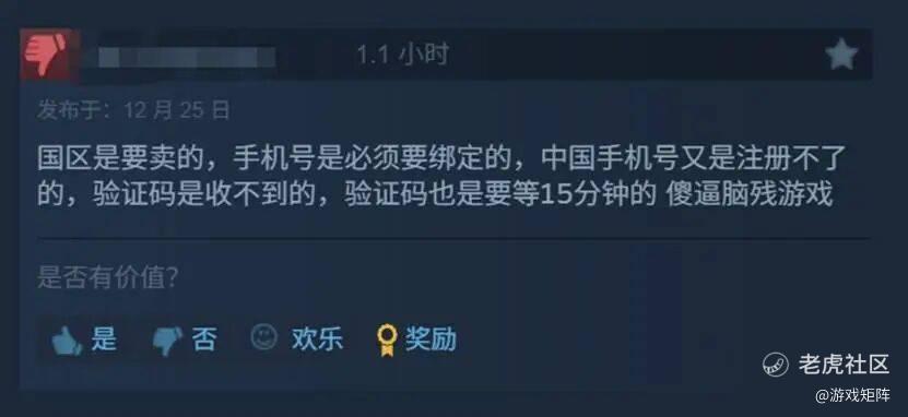 从玩家评论来看,即使已经到了“正式版”阶段,但国内玩家想要好好玩到还是很难:国区成为高价区;服务器卡、优化差;进游戏要手机号,但中国手机又收不到验证码……一根筋变成了两头堵。