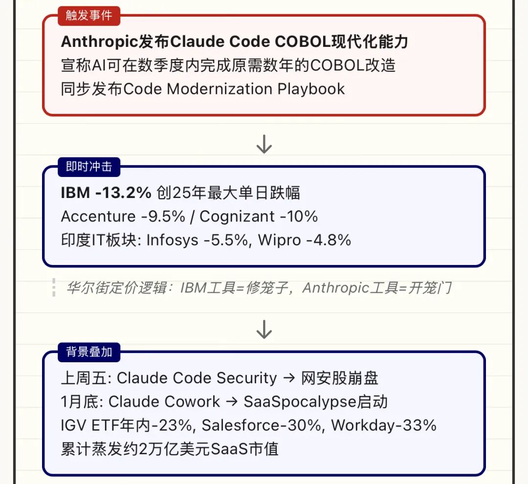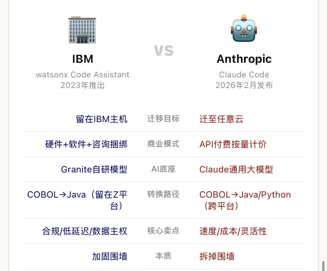 但市场给出的定价逻辑很残酷:IBM的AI工具是为了把客户留在自家主机上,而Anthropic的工具是帮客户搬走。这才是致命区别。