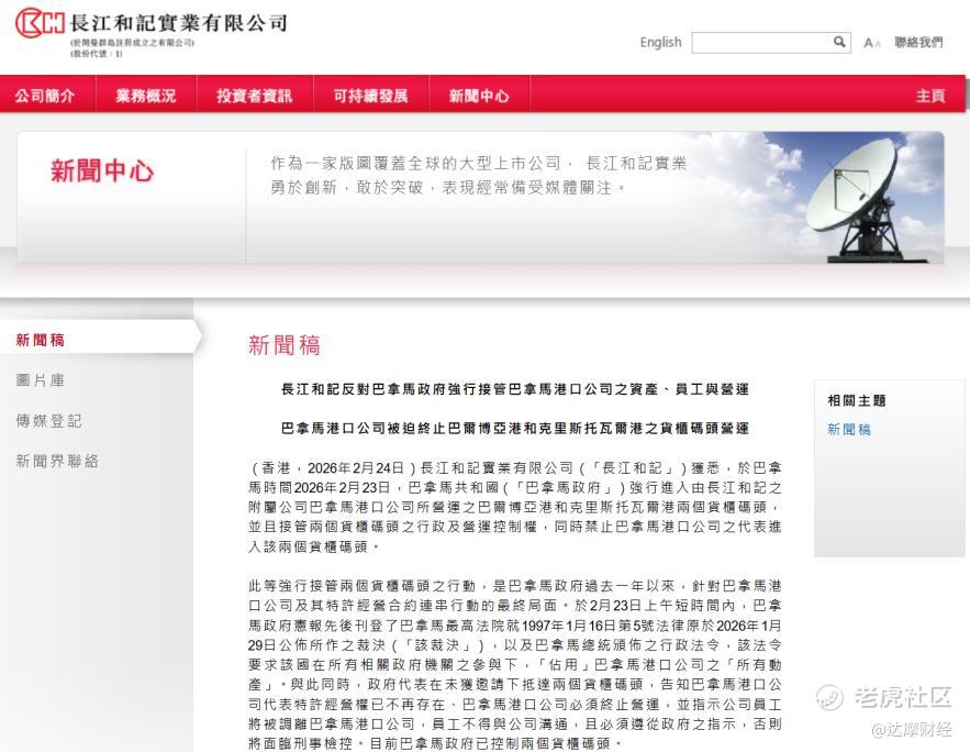 就在前一日,长和在巴拿马运营的两座港口巴尔博亚港、克里斯托瓦尔港遭到巴拿马政府强行接管。据财新报道,巴拿马政府指定丹麦马士基集团子公司APM Terminals临时接管巴尔博亚港的运营,并指定地中海航运公司旗下的TiL巴拿马临时接管克里斯托瓦尔港的运营,临时港口经营权为期18个月。