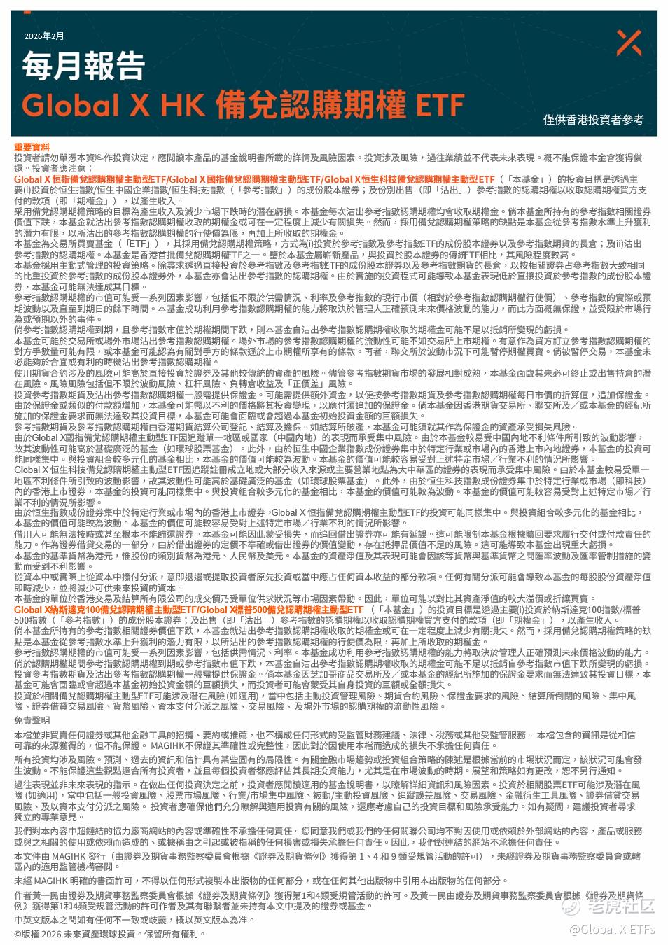 投资于相关备兑认购期权主动型 ETF 可能涉及潜在风险 (如适用),当中包括主动投资管理风险、期货合约风险、保证金要求的风险、结算所倒闭的风险、集中风险、证券借贷交易风险、货币风险、资本支付分派之风险、交易风险、及场外市场的认购期权的流动性风险。备兑认购期权策略在一定程度上有可能限制了从参考指数上升的获利潜力。备兑认购期权策略为崭新产品其风险程度较高。
