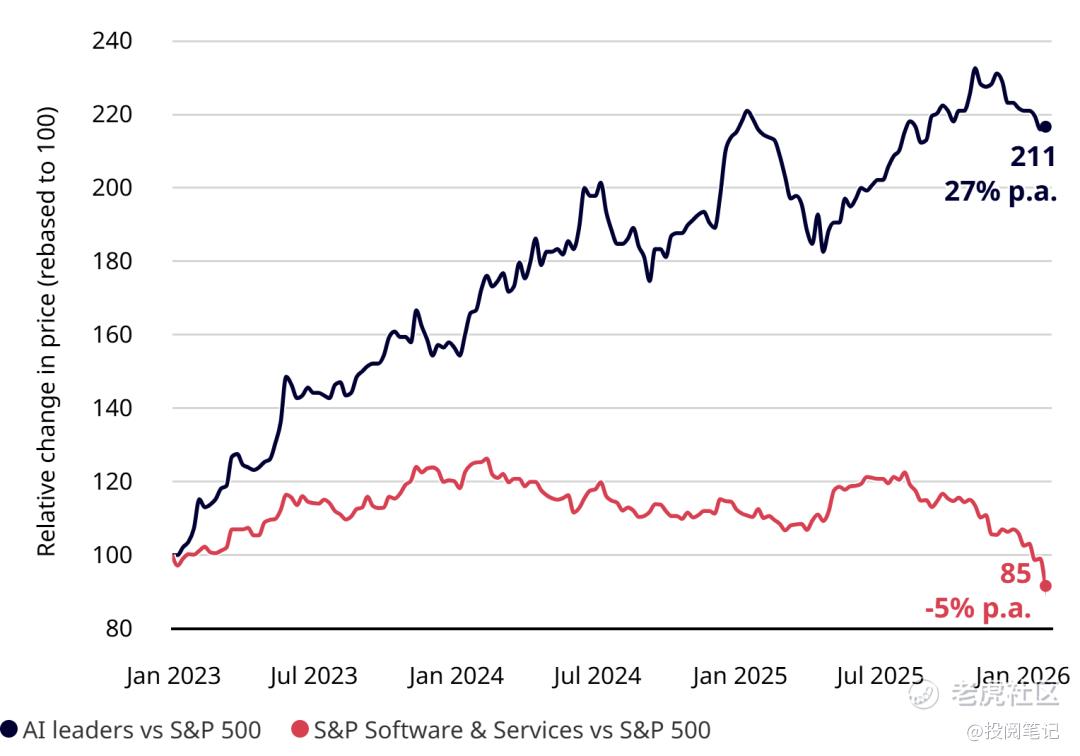 人工智能领军企业股价飙升,软件股持续走低(2023-2026年,经基准调整)
