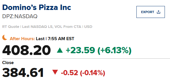 Domino's Pizza (DPZ)第四季度每股收益为5.35美元,比市场预期值5.38美元低0.03美元;营收同比增长 6.4%,达到 15.4 亿美元,市场预期值 15.2 亿美元。Domino's Pizza 将其季度股息提高了15%,达到1.99美元。