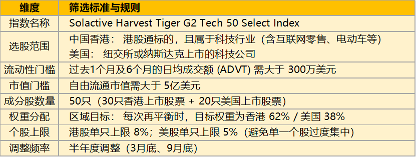 采取62%港股 + 38% 美股的动态平衡机制,成分股数量为50只(30只香港上市股票 + 20只美国上市股票);