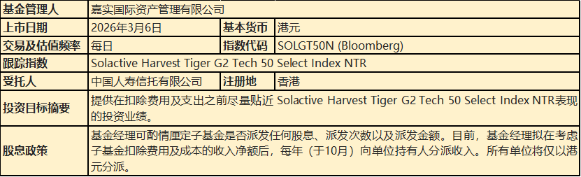 该基金投资目标是提供尽量贴近Solactive Harvest Tiger G2 Tech 50 Select Index表现的投资成绩(扣除费用及支出之前),年管理费率为0.99%: