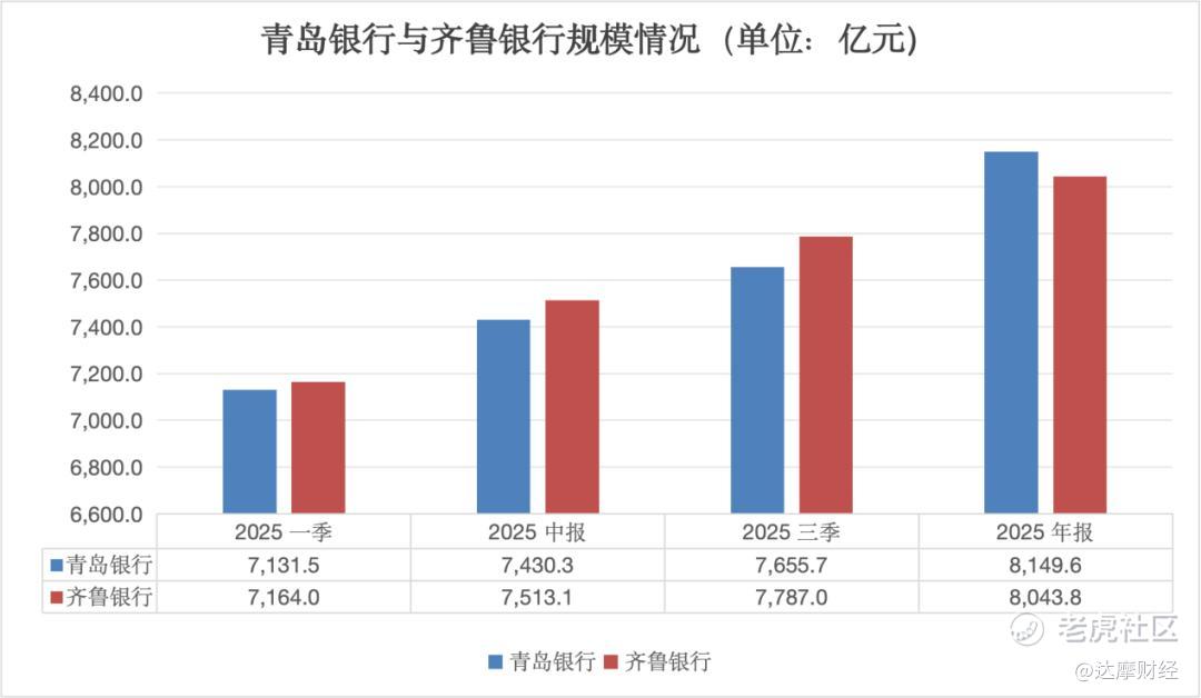 这种情况一直持续了三个季度,令人意外的是,2025年收官,青岛银行一举冲刺,再度夺回山东银行“一哥”的位置。截至年末,青岛银行的资产规模为8149.6亿元,相比齐鲁银行8043.8亿元的规模领先百亿元。