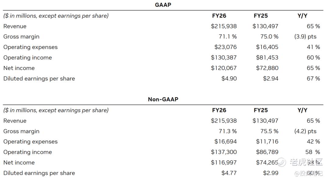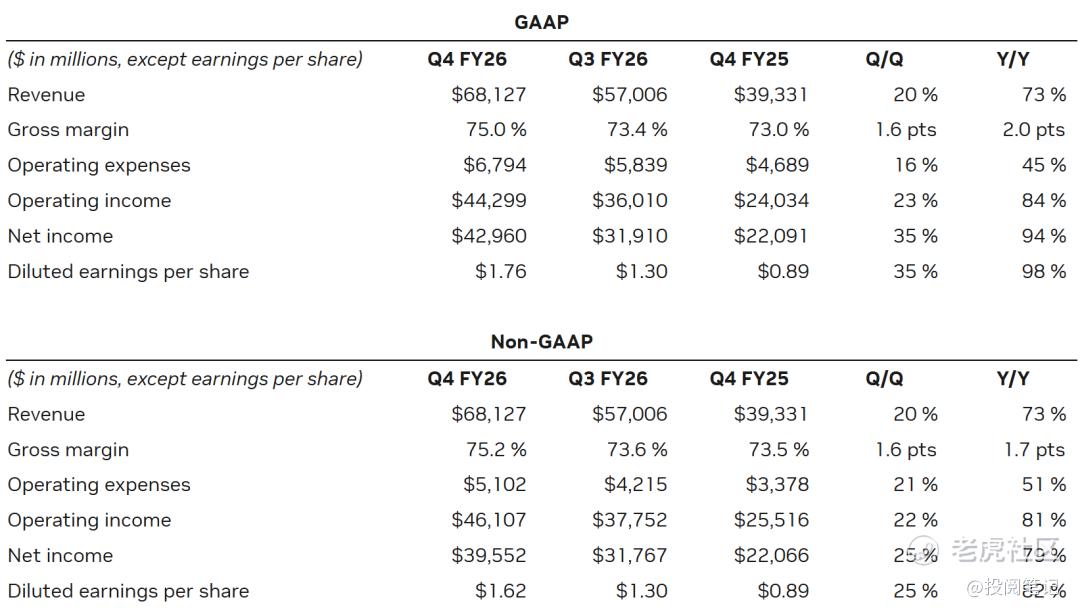 实现营收681亿美元,较上一季度增长20%,较去年同期增长73%。2026财年总营收达2159亿美元,同比增长65%,业务详情,请看业务亮点这一部分的内容。