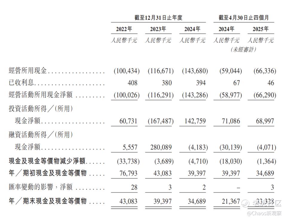 如果说亏损是成长性企业的“慢性病”,那么糟糕的现金流就是企业足以致命的“心梗前兆”。招股书显示,2025年前四个月,哥瑞利经营活动所用现金净额为6629万元,月均现金流出超过1650万元。若仅依赖3333万元的账面现金,公司甚至撑不过两个月。