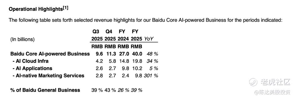 4Q25 百度总营收327亿(vs 4Q24 341亿),核心收入里的广告承压,市场有预期;这次百度首次披露,AI业务收入占一般性业务收入的43%(同口径对比2024年为26%,同样是第一次披露),这个占比应该是超过市场预期的。收入数据说明,AI在多个业务中产生真实收入,且主要来自企业和用户为实际效果付费,而非短期投流或者补贴。