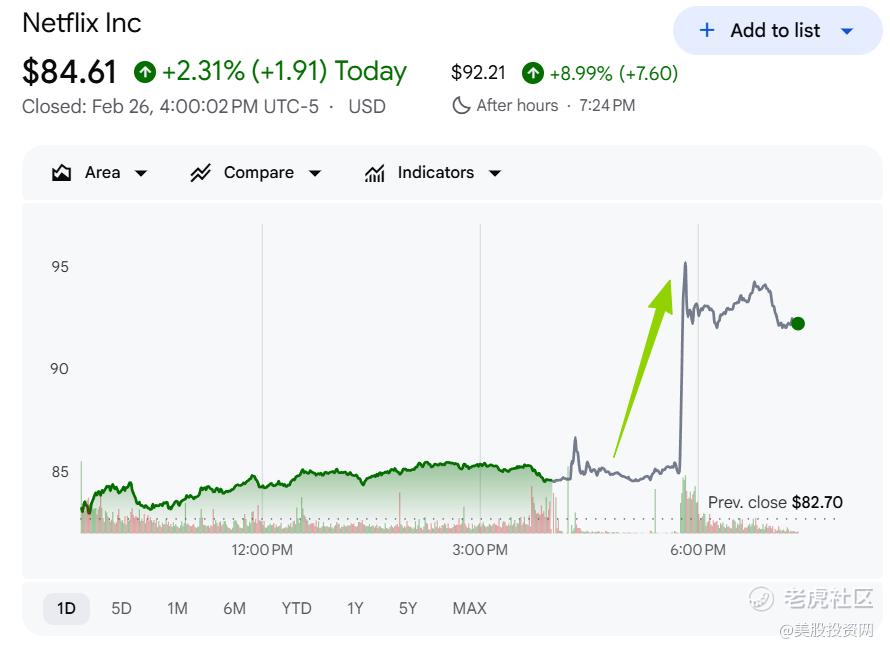 美东时间周四,奈飞(NFLX)在美股盘后大幅上涨约10%。盘后大涨的背后,是公司在华纳兄弟探索(WBD)收购谈判中的关键抉择,以及对自身资本配置策略的调整。这两项消息共同改变了市场对奈飞风险与价值的定价逻辑。 $奈飞(NFLX)$