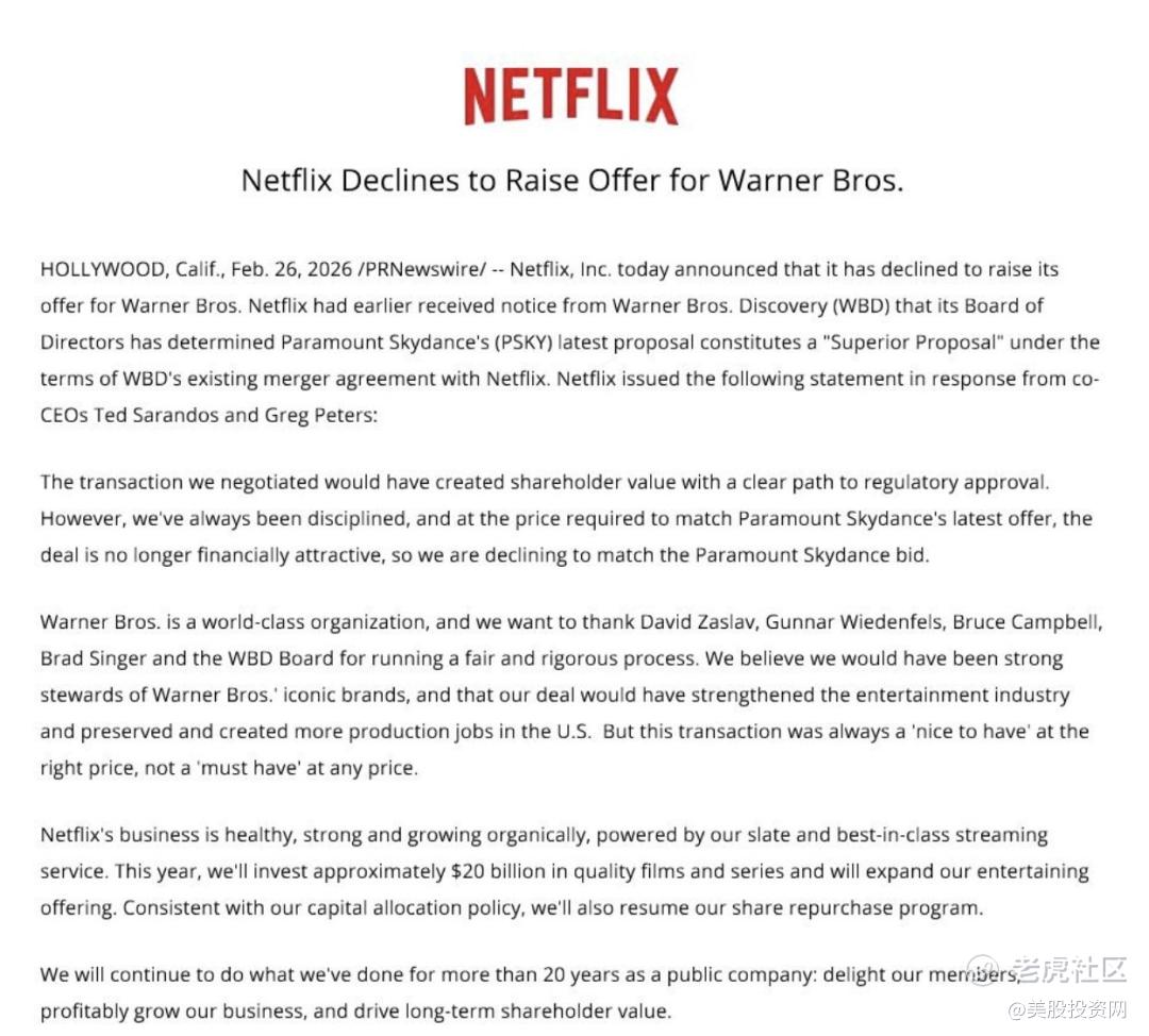 今日奈飞宣布拒绝进一步提高自己的收购报价,并重启了股.票回购计划。这一动作本质上意味着:公司放弃竞标中的价格战,而选择回归自身资本配置优先级。