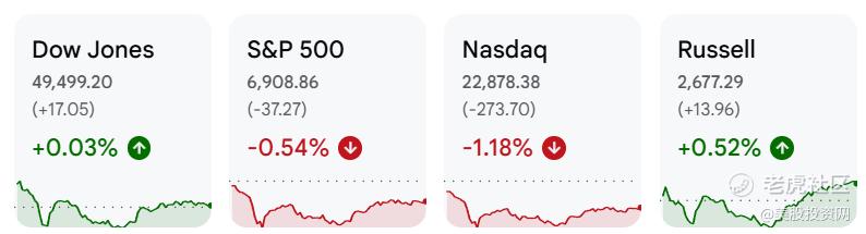 美东时间周四,美股内部出现明显分化。道指小幅收涨,纳指下跌近1.2%,几乎回吐前一日全部涨幅,罗素2000指数则逆势上涨约0.5%。指数层面看似平稳,但结构上已经出现清晰的风格轮动——资金开始从高度集中的科技权重中阶段性流出。