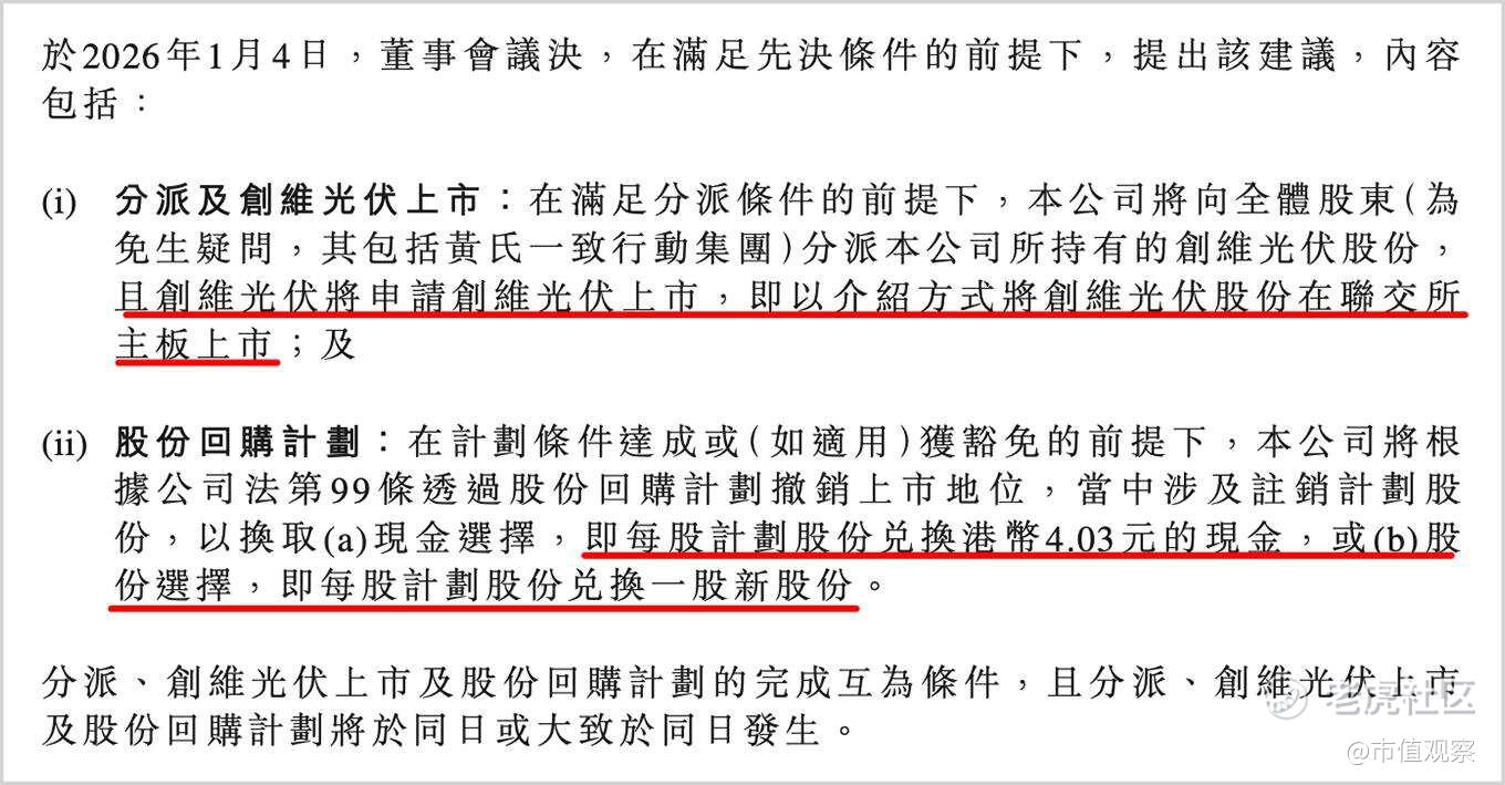 而且,此次私有化方案也较为慷慨,创维给股东提供了两套方案,一是以4.03港元/股的价格进行回购;二是将创维集团的股票“一股换一股”换成创维光伏。无论哪种方式,都比公告前直接卖股票更划算。