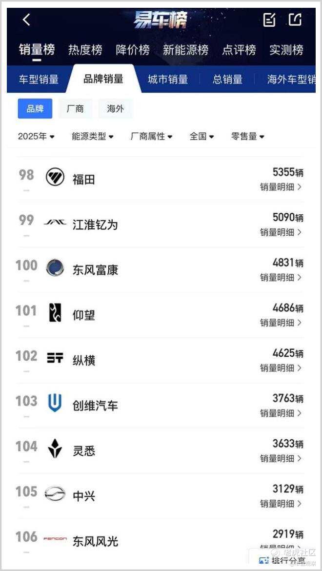 ▲2025年国内汽车(按品牌)销量排名,来源:易车榜