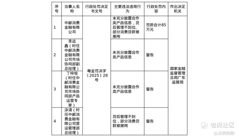 去年,中邮消金曾被监管部门开出85万元罚单,被处罚的原因是其涉及“未充分披露合作类产品信息,以及贷后管理不到位,导致部分消费贷款被挪用”等违规行为。再加上黑猫投诉平台上积累的上万条相关投诉反馈,都说明了中邮消金在第三方渠道管理、息费透明度等方面的不足。
