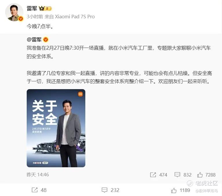 雷军亲自直播,安全高于一切。小米,加油!