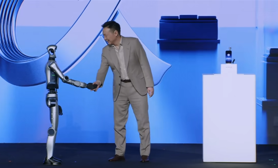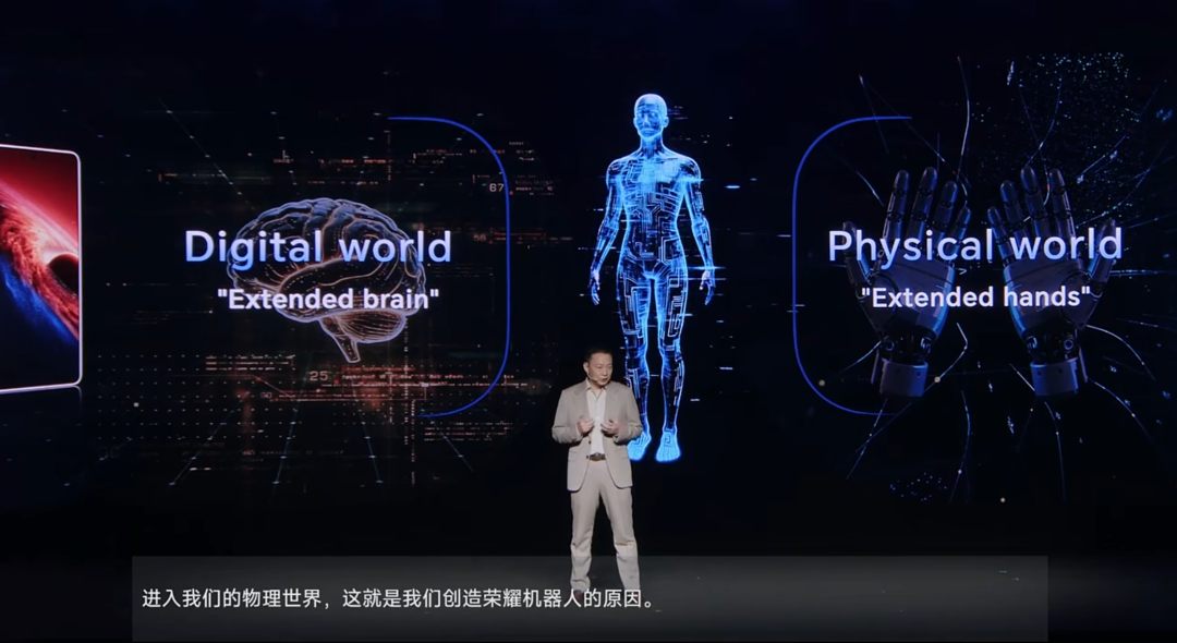 发布会现场,荣耀 CEO 李健与这款造型流畅、满溢科技质感的人形机器人 Robot 同台亮相,完成了产品的全球首秀。