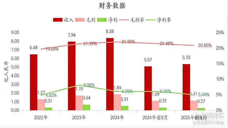 净利分别约为人民币0.31亿元、0.64亿元、0.51亿元、0.31亿元、0.27亿元,2025年前8月同比-12.49%;