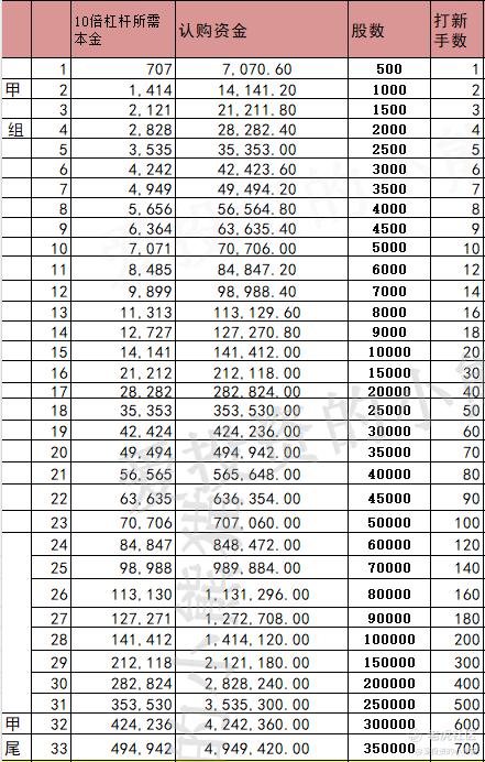 这个票甲尾495万,乙头需要认购资金566万,乙组的各档融资所需要的本金还有融资金额对应如下表: