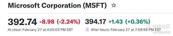 截至2月27日,微软股价收报392.74美元。对比四个月前539.83美元的高点,这27%的回撤反映出市场估值中枢的主动下移。
