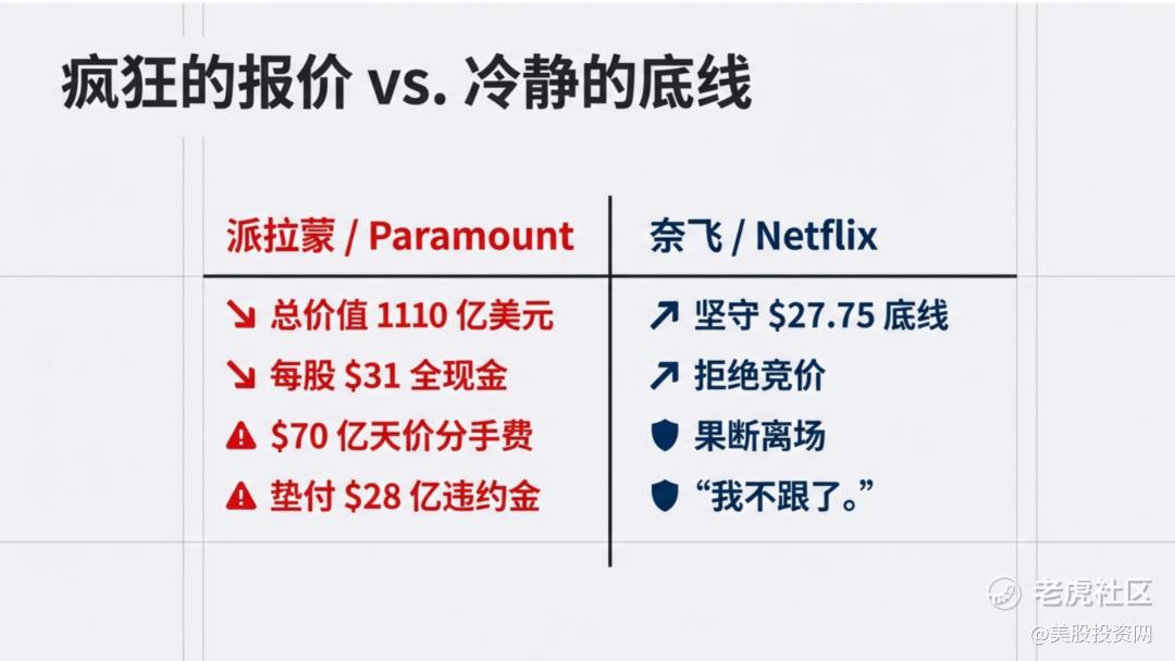 在上周,奈飞竟然大方地给了华纳(WBD)7 天的豁免期,允许它重新回去跟派拉蒙(PSKY)谈。奈飞联席 CEO 萨兰多斯事后说得很直白:派拉蒙一直在外围制造大量噪音,提出各种假设性的报价,搞得股东们晕头转向。奈飞主动让出这 7 天,就是为了“引蛇出洞”,逼派拉蒙把底牌亮在明处,给市场一个彻底的清晰度。