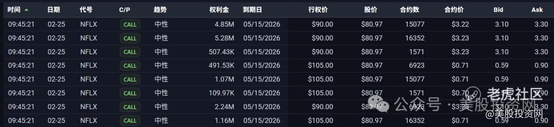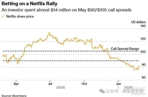 这意味着只要奈飞股价涨破 92.51 美元,这笔买卖就开始盈利,而一旦股价冲破 105 美元,其收益率将直接飙升至接近 5 倍。这种布局反映出职业玩家极高的胜率思维:他们并不贪婪地博取无限上涨,而是利用并购传闻带来的波动,以极小的成本锁定了最确定的反弹区间。