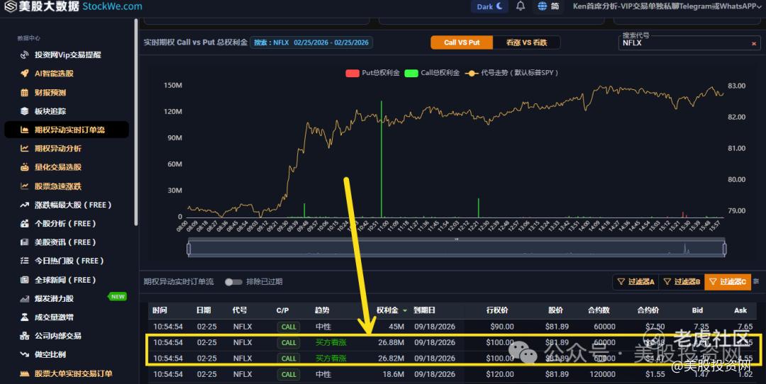 时间回溯到本周三(2月25日),当外界还在为“奈飞是否会陷入高价并购泥潭”争论不休时,我们的美股大数据平台 StockWe.com 连续监测到了两波极其罕见的资金动作,精准地锁定了奈飞的短期底部。