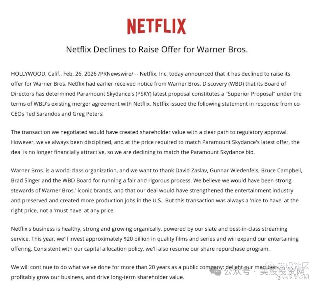 到了周四(2月26日),真相大白。很多人可能没注意到,这场并购战之所以能如此戏剧性地收尾,是因为奈飞主动下了一手“绝户棋”。