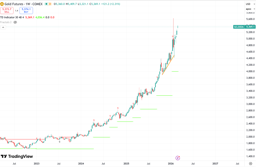 黄金上周的空单成交一半,本周一又成交了一半,均价在 5300,止损设立在新高之上的5630,目标设置在4870和4490。 $黄金主连 2604(GCmain)$ $微黄金主连 2604(MGCmain)$