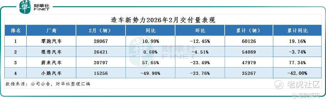 在新势力阵营中,零跑汽车虽然依旧领先,但2月交付量已回落至2万辆区间,为28067辆,同比增长10.99%,环比下滑12.45%;1-2月累计交付60126辆,同比增长19.16%。